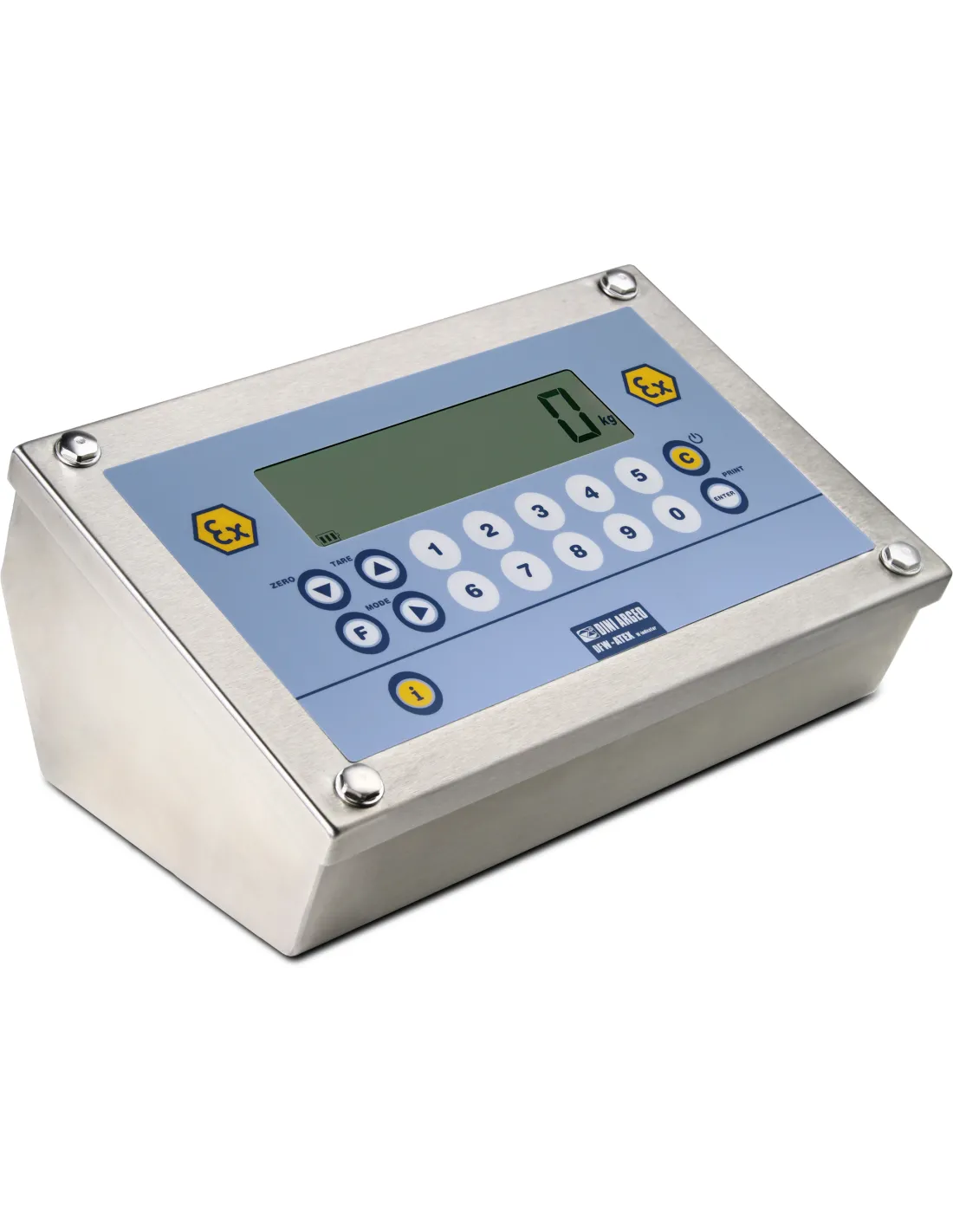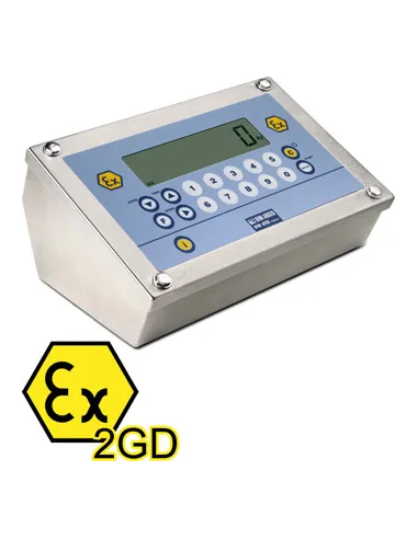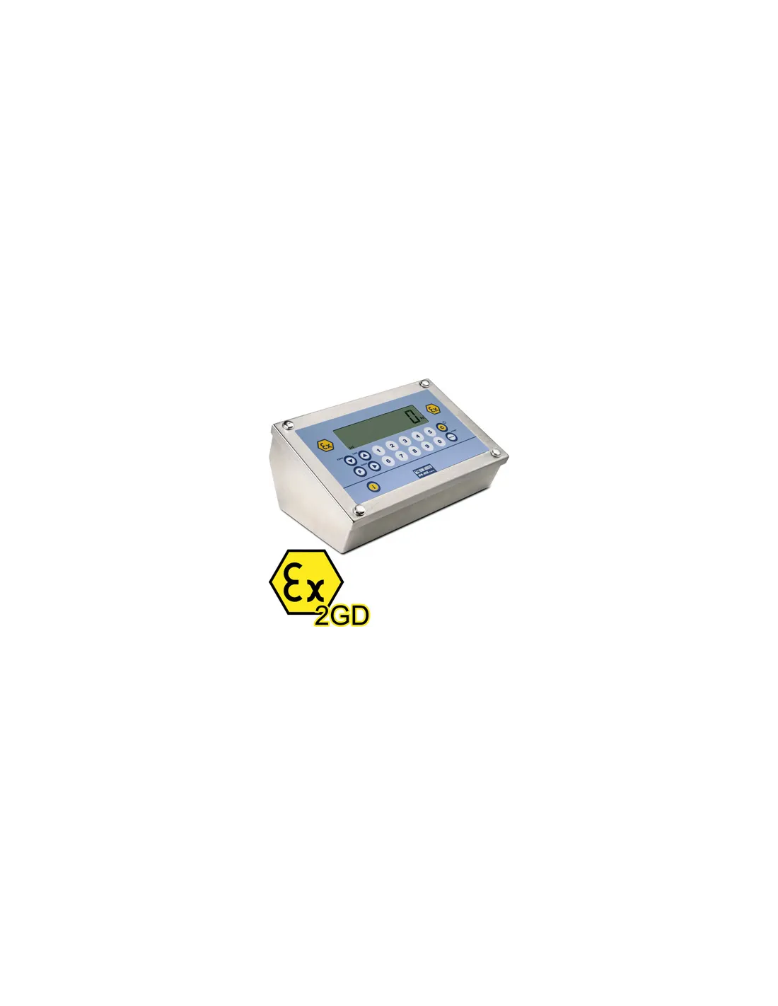 Indicateur de poids pour zones ATEX, multifonction, avec boîtier en acier INOX IP65, clavier à 17 touches et afficheur LCD rétro éclairé.