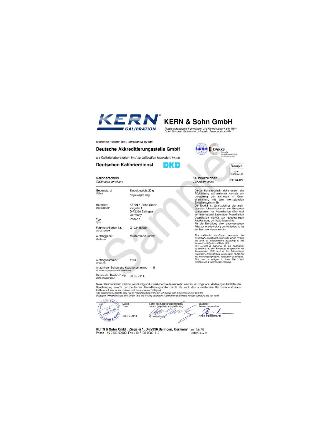 Certificat d'étalonnage Kern pour la balance PCB de 100g à 3.5kg